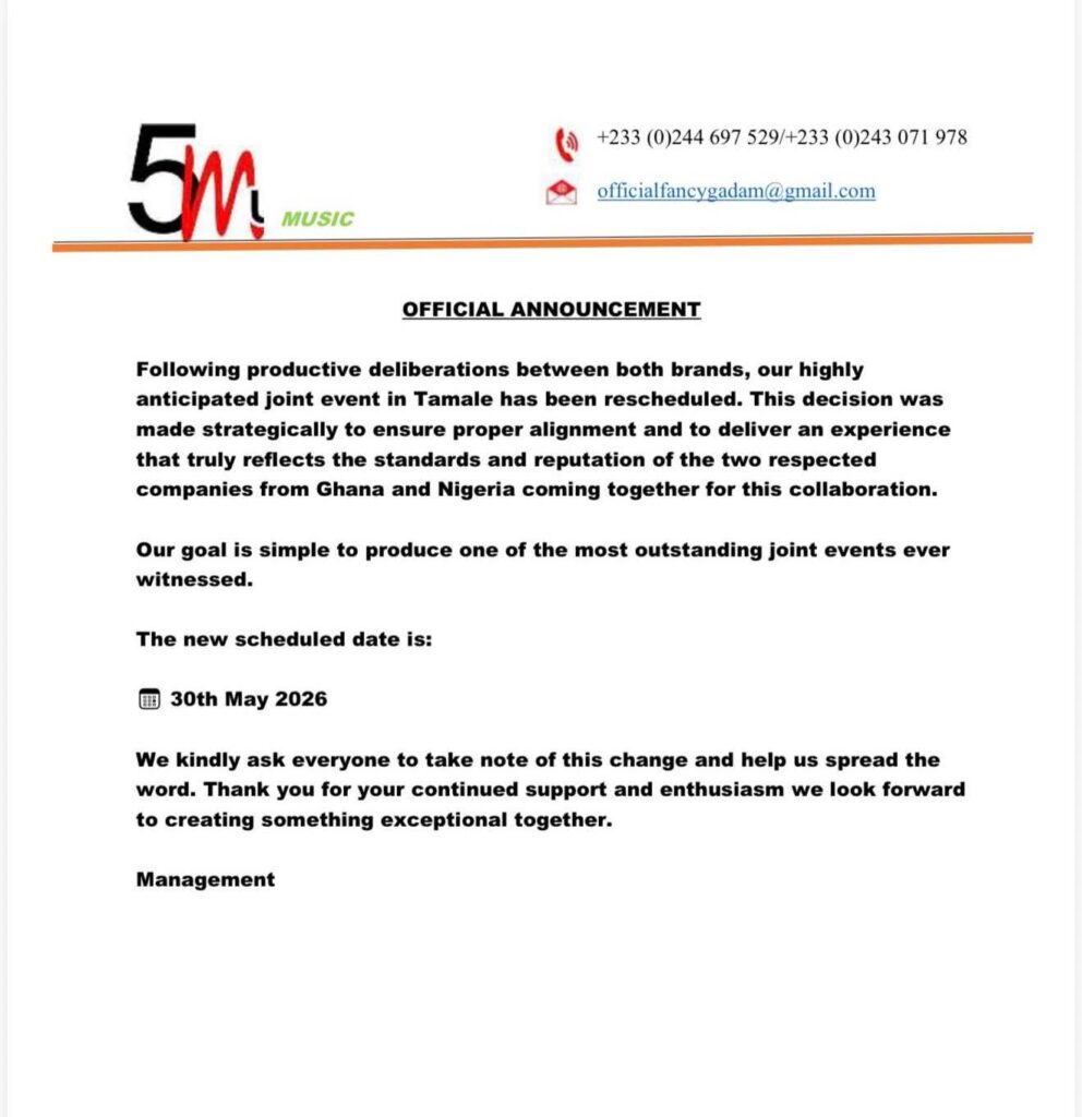 Management of Ghanaian music star Fancy Gadam, 5M Music, has announced a new date for the much-anticipated joint concert featuring the award-winning artiste and a Nigerian superstar.
