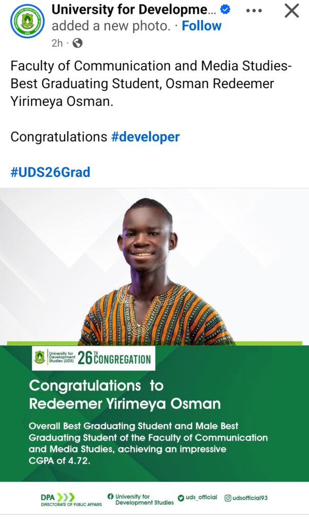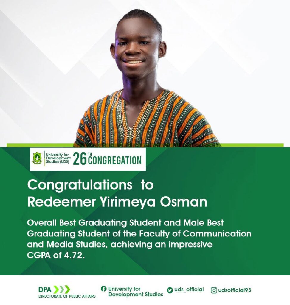 The University for Development Studies (UDS) has announced Osman Redeemer Yirimeya Osman as the Best Graduating Student from the Faculty of Communication and Media Studies at the 26th Congregation.